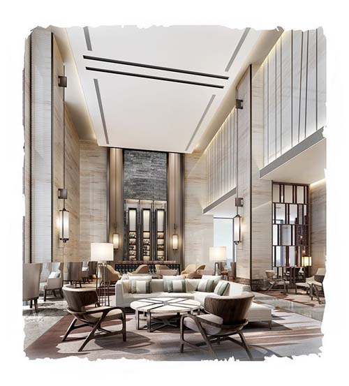 酒店裝修設計中主要的大堂設計風格有四種,即庭院式,現代式,重技式和古典式。客人可以享受酒店的功能和概念,以及一些從視酒店的大堂設計點門道。因此,大堂裝修設計應注意酒店裝修設計風格融合,以影響顧客的視覺效果,以吸引更多的客戶。